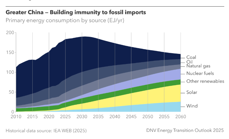 DNV认为,这一轮冲击虽然最先、最重地打在亚洲身上,但也正因如此,亚洲尤其是中国,未来摆脱油气进口依赖的动力将更强。报告提到,过去三周,中国电池制造商在资本市场上的表现已经超过国际油气公司。DNV将其解读为一种非常清晰的长期信号:市场资金正在押注更快的电动车普及,也在押注随着可再生能源加速扩张,对电网储能的需求同步增强。在报告第三页的图表中,DNV还专门给出“大中华区构建化石燃料进口免疫力”的判断框架,展示未来一次能源消费结构中风能、太阳能、核能等占比提升的趋势。该图传递的信息非常直接:对于中国这样的大型能源进口经济体而言,强化本土电力系统、提升新能源占比、增强储能和电网能力,不只是减碳问题,更是典型的能源安全问题。这对航运业的启示同样深远。因为未来真正会被优先保留的化石燃料使用场景,很可能将集中在航空、航运、重工业等“更难减排”的部门。DNV明确指出,如果类似的供应冲击发生在10年后,很多国家的电力、道路交通和建筑供热体系对化石燃料冲击的暴露度将明显下降,而国家储备将能够更优先保障航空、航运和重工业等仍高度依赖油气的行业。但转型不会一帆风顺,成本同样会上升
