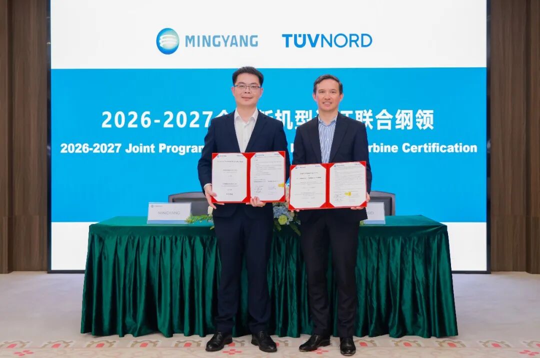 本次型式认证严格遵循国际最高标准,全面验证了机型在设计、安全、性能、可靠性等方面的一流水准。认证推进过程中,明阳团队高效协同、全力攻坚,以硬核技术实力与严谨管控体系,顺利完成全部认证流程,为产品全球化推广筑牢根基。右:TÜV NORD全球可再生能源执行副总裁Alexander Ohff 仪式现场,双方同步签署2026-2027年全球新机型认证合作纲领,进一步助力明阳全系列机型快速进入欧洲等国际市场。