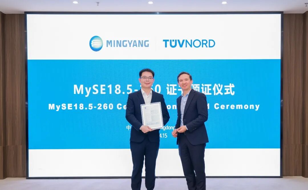 4月15日,明阳智能MySE18.5-260海上风电机组产品国际证书颁证仪式在明阳集团全球总部圆满举行。TÜV NORD为这款18.5MW级旗舰机型授予国际认证证书,标志着明阳自主研发的高端海上风电产品再获国际权威认可,为其全球化布局树立起一座关键里程碑。