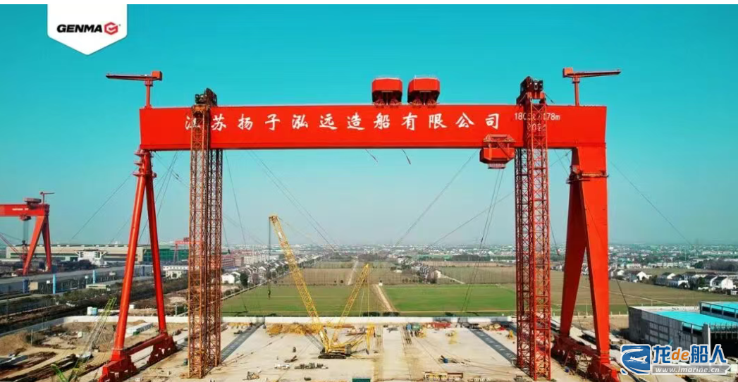 扬子泓远造船岸线长度约1320米,占地面积约1300亩,将建设30万吨级造船坞一座,20万吨级舾装码头一座,10万吨级港池一座,年生产能力约80万载重吨。该船厂配备1800吨龙门吊,跨度178米,起升高度90米,抬吊能力1800吨,翻身能力1000吨,能够满足清洁能源船舶等大型分段的高强度吊装需求。