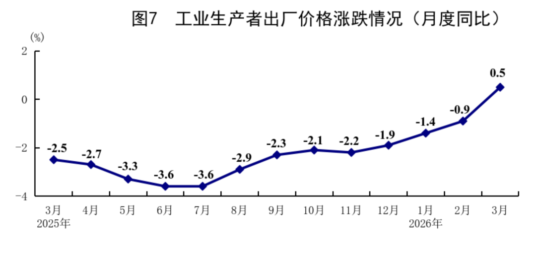 ◆ 一季度,全国工业生产者出厂价格同比下降0.6%,降幅比上年四季度收窄1.5个百分点