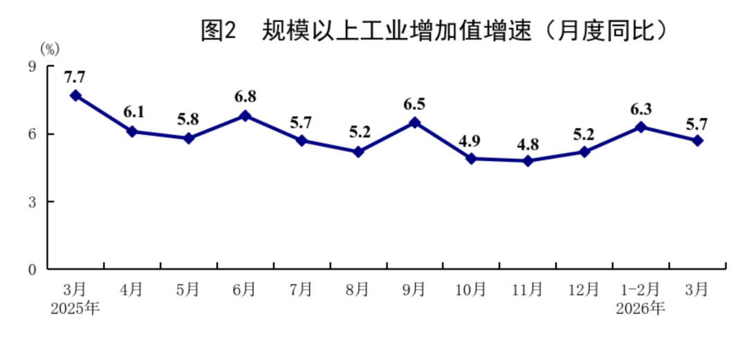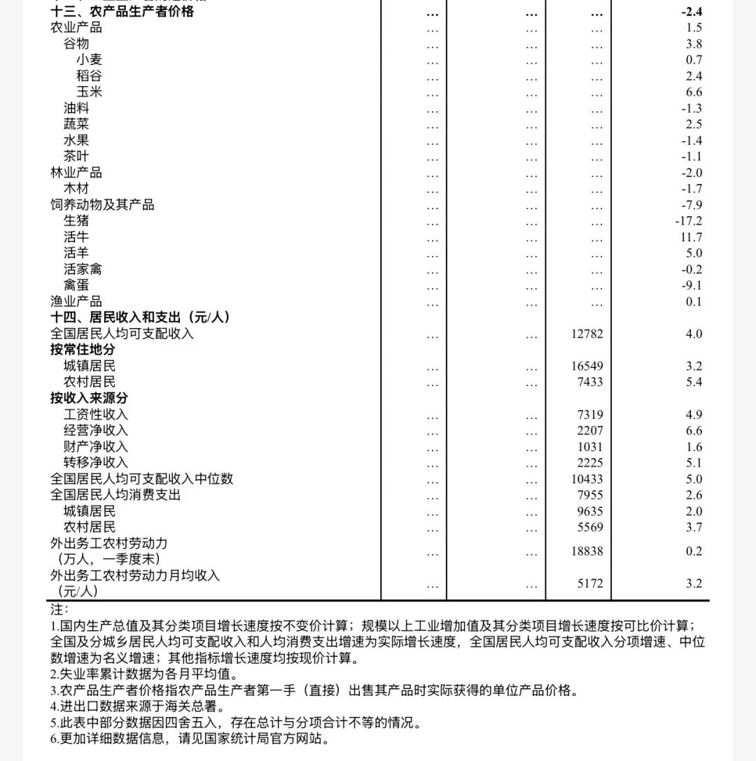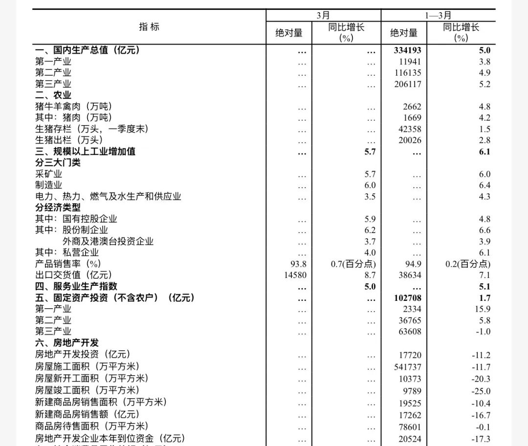 一季度,在以习近平同志为核心的党中央坚强领导下,各地区各部门深入贯彻落实党中央、国务院决策部署,加紧实施更加积极有为的宏观政策,着力稳就业、稳企业、稳市场、稳预期,加快培育发展新质生产力,生产供给增长加快,市场需求继续改善,就业形势总体稳定,市场价格温和回升,高质量发展向新向优,国民经济实现良好开局,发展韧性和活力进一步彰显。初步核算,一季度国内生产总值334193亿元,按不变价格计算,同比增长5.0%,比上年四季度加快0.5个百分点。分产业看,第一产业增加值11941亿元,同比增长3.8%;第二产业增加值116135亿元,增长4.9%;第三产业增加值206117亿元,增长5.2%。从环比看,一季度国内生产总值增长1.3%。一季度,农业(种植业)增加值同比增长3.7%。冬小麦播种面积保持稳定,苗情持续向好转化,春耕备耕进展顺利。据全国种植意向调查显示,今年粮食意向播种面积总体稳定,其中,稻谷面积基本持平,玉米面积稳中有增。一季度,猪牛羊禽肉产量2662万吨,同比增长4.8%,其中,猪肉、禽肉产量分别增长4.2%、9.3%,牛肉、羊肉产量分别下降1.4%、2.0%;牛奶产量增长3.4%,禽蛋产量下降3.1%。一季度,生猪出栏20026万头,同比增长2.8%;季末生猪存栏42358万头,增长1.5%。二、工业生产增长加快,装备制造业和高技术制造业快速增长一季度,全国规模以上工业增加值同比增长6.1%,比上年四季度加快1.1个百分点。分三大门类看,采矿业增加值同比增长6.0%,制造业增长6.4%,电力、热力、燃气及水生产和供应业增长4.3%。装备制造业增加值同比增长8.9%,高技术制造业增加值增长12.5%,分别快于全部规模以上工业增加值2.8和6.4个百分点。分经济类型看,国有控股企业增加值同比增长4.8%;股份制企业增长6.6%,外商及港澳台投资企业增长3.9%;私营企业增长6.1%。分产品看,3D打印设备、锂离子电池、工业机器人产品产量同比分别增长54.0%、40.8%、33.2%。3月份,规模以上工业增加值同比增长5.7%,环比增长0.28%。3月份,制造业采购经理指数为50.4%,比上月上升1.4个百分点;企业生产经营活动预期指数为53.4%。1—2月份,全国规模以上工业企业实现利润总额10246亿元,同比增长15.2%。一季度,服务业增加值同比增长5.2%。其中,租赁和商务服务业,信息传输、软件和信息技术服务业,金融业,交通运输、仓储和邮政业,住宿和餐饮业增加值分别增长12.2%、10.6%、6.5%、4.3%、4.3%。3月份,全国服务业生产指数同比增长5.0%。其中,信息传输、软件和信息技术服务业,租赁和商务服务业,金融业生产指数分别增长11.8%、10.1%、6.7%。1—2月份,规模以上服务业企业营业收入同比增长7.4%。3月份,服务业商务活动指数为50.2%,比上月上升0.5个百分点;服务业业务活动预期指数为54.8%。其中,铁路运输、电信广播电视及卫星传输服务、货币金融服务、保险等行业商务活动指数位于55.0%以上较高景气区间。一季度,社会消费品零售总额127695亿元,同比增长2.4%,比上年四季度加快0.7个百分点。按经营单位所在地分,城镇消费品零售额110574亿元,同比增长2.3%;乡村消费品零售额17121亿元,增长3.1%。按消费类型分,商品零售额113072亿元,增长2.2%;餐饮收入14623亿元,增长4.2%。基本生活类和部分升级类商品销售增长较快,限额以上单位粮油食品类、服装鞋帽针纺织品类、通讯器材类、金银珠宝类商品零售额同比分别增长10.0%、9.3%、20.8%、12.6%。3月份,社会消费品零售总额同比增长1.7%,环比增长0.14%。一季度,服务零售额同比增长5.5%,增速与上年全年持平。其中,通讯信息服务类、旅游咨询租赁服务类、文体休闲服务类零售额较快增长。一季度,全国网上商品和服务零售额49774亿元,同比增长8.0%。其中,网上商品零售额31614亿元,增长7.5%,占社会消费品零售总额的比重为24.8%;网上服务零售额18160亿元,增长8.8%。一季度,全国固定资产投资(不含农户)102708亿元,同比增长1.7%,上年全年为下降3.8%;扣除房地产开发投资,全国固定资产投资增长4.8%。分领域看,基础设施投资同比增长8.9%,制造业投资增长4.1%,房地产开发投资下降11.2%。全国新建商品房销售面积19525万平方米,同比下降10.4%;新建商品房销售额17262亿元,下降16.7%。分产业看,第一产业投资同比增长15.9%,第二产业投资增长5.8%,第三产业投资下降1.0%。民间投资同比下降2.2%,降幅比上年全年收窄4.2个百分点;扣除房地产开发投资,民间投资增长1.3%。高技术产业投资同比增长7.4%,其中计算机及办公设备制造业,航空、航天器及设备制造业,信息服务业投资分别增长28.3%、19.0%、20.9%。3月份,固定资产投资(不含农户)环比增长0.52%。一季度,货物进出口总额118380亿元,同比增长15.0%。其中,出口68467亿元,增长11.9%;进口49913亿元,增长19.6%。一般贸易进出口同比增长9.0%。对共建“一带一路”国家进出口增长14.2%。民营企业进出口增长16.2%,占进出口总额的比重为57.3%。机电产品出口增长18.3%。3月份,进出口总额41046亿元,同比增长9.2%。一季度,全国居民消费价格(CPI)同比上涨0.9%,涨幅比上年四季度扩大0.4个百分点。分类别看,食品烟酒及在外餐饮价格同比上涨0.5%,衣着价格上涨1.8%,居住价格下降0.2%,生活用品及服务价格上涨2.3%,交通通信价格下降1.1%,教育文化娱乐价格上涨1.0%,医疗保健价格上涨1.8%,其他用品及服务价格上涨14.1%。在食品烟酒及在外餐饮价格中,猪肉价格下降11.3%,粮食价格下降0.3%,鲜果价格上涨4.3%,鲜菜价格上涨7.6%。扣除食品和