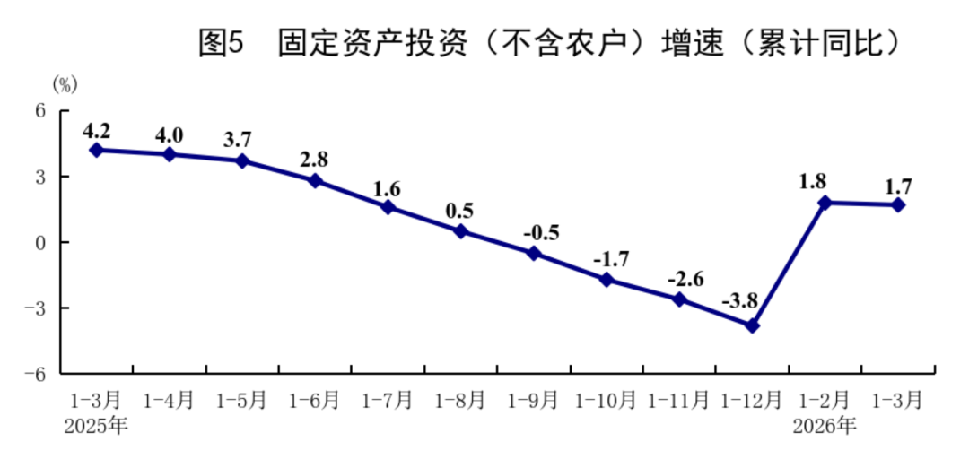 ◆ 一季度,全国固定资产投资(不含农户)102708亿元,同比增长1.7%,上年全年为下降3.8%;扣除房地产开发投资,全国固定资产投资增长4.8%