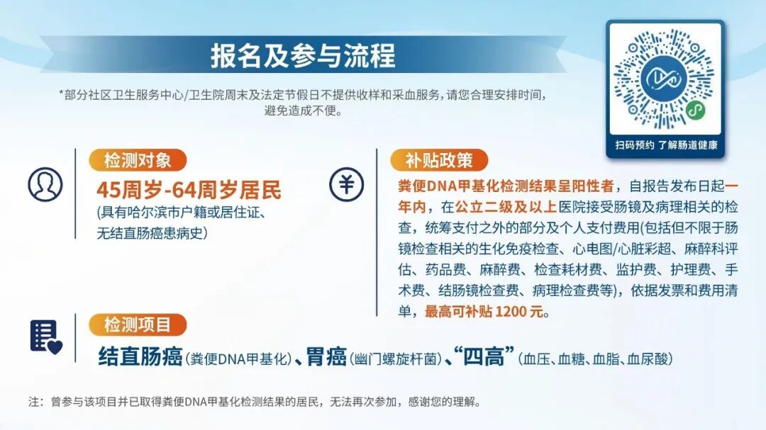 本次“两癌四高”惠民项目面向45至64周岁的哈尔滨市民,提供结直肠癌(粪便DNA甲基化)、胃癌(幽门螺旋杆菌)及“四高”(高血压、高血脂、高血脂、高血尿酸)免费检测服务。截至今年3月,项目累计预约超128万人,成功检出大量结直肠癌及肠道病变病例,助力市民完成肠镜检查,构建起“筛查-诊断-治疗”的全流程健康管理闭环。