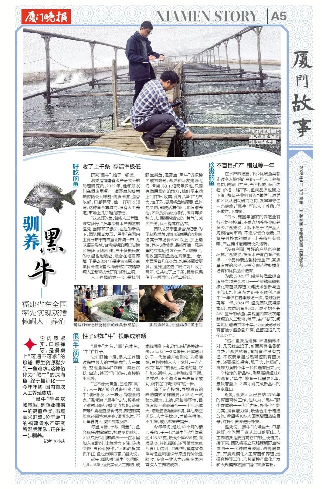 “黑牛”学名灰鳍棘鲷,是渔业捕捞中的高值鱼类,市场需求旺盛。位于厦门的福建省水产研究所温凭团队,正在进一步驯养。