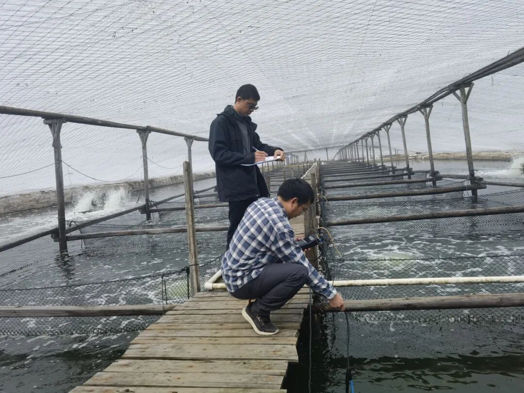 温凭(站立者)和团队成员正在监测养殖池水质。