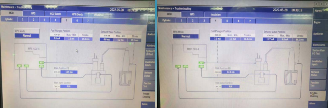 某轮配备7G80 ME C9.5型低速电控主机,锚泊用车期间,主机突发NO.4缸排气阀行程低警报,触发SLOW DOWN降速保护,FIVA阀阀芯位置反馈信号固定在19mA,无法正常动态响应(FIVA阀组件可能存在卡阻)。