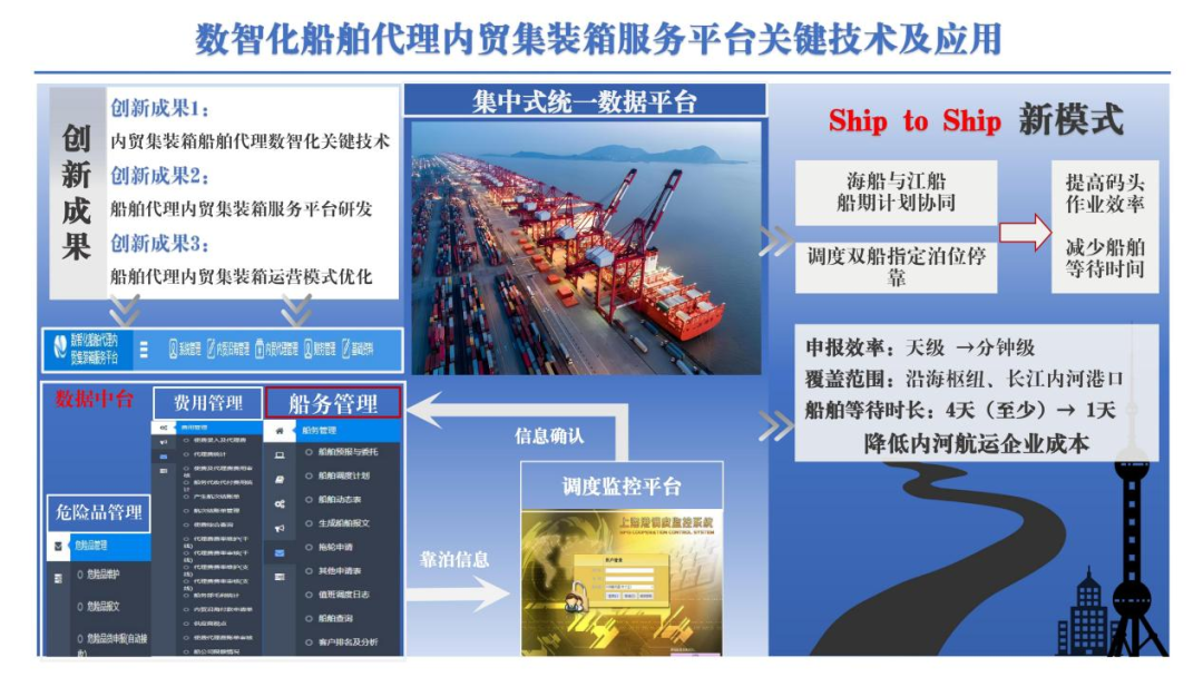 项目聚焦内贸集装箱船舶代理业务“小、散、杂”的行业痛点,通过关键技术突破、综合服务平台研发与作业模式创新,构建了数智化船舶代理内贸集装箱服务平台。项目实现了船、港、货数据的全面贯通与智能协同,创新推出“Ship to Ship协同作业”新模式,有效提升了港口作业效率与资源利用率。