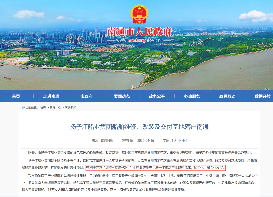 南通官方对该项目的定性也非常直白:这是“维修+改装+交付”全链条基地。换句话说,扬子江不是在给造船主业做简单配套,而是在给未来的客户粘性、服务收入和绿色升级能力搭底座。