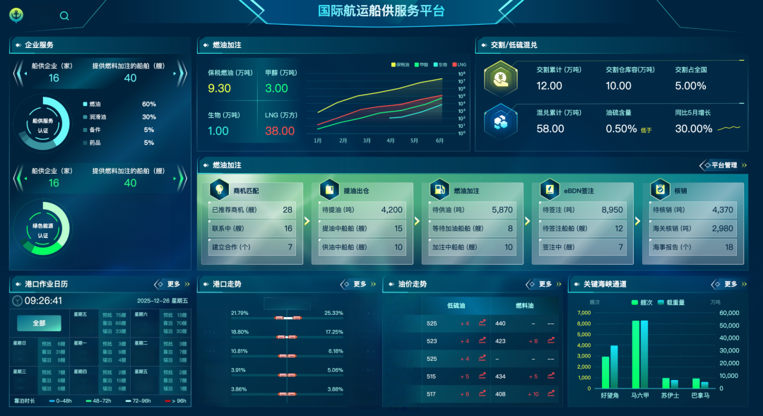 在上海临港新片区国际航运服务中心内,3块大屏滚动显示全球航运指数和船舶预抵信息,为港区装上实时“大脑”。“我们把船供服务做成了可视、可追溯的数字流程。”中远海运科技股份有限公司(简称中远海运科技)数字航运服务事业部陈怀海介绍。
