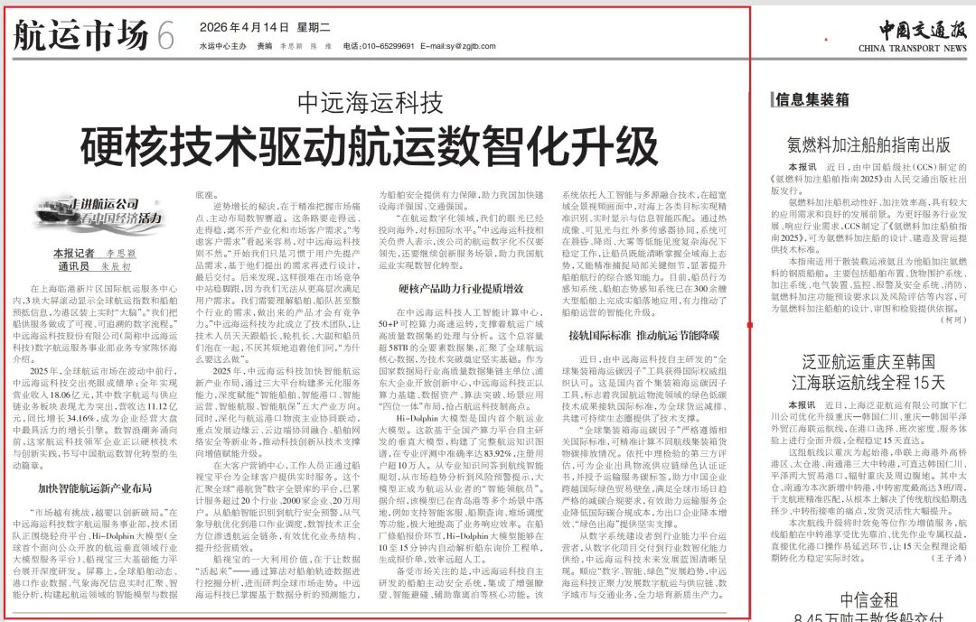 4月14日《中国交通报》第6版刊发文章《中远海运科技硬核技术驱动航运数智化升级》,介绍公司数字航运与供应链业务以硬核技术推动航运数智化转型,通过布局轻舟平台、Hi-Dolphin大模型等基础平台,深耕智能航运产业,以船视宝、船舶主动安全系统等产品赋能航运全链条,并自主研发碳因子工具接轨国际标准,助力行业节能降碳,为建设交通强国、海洋强国、航运强国建设提供技术支撑。全文如下: