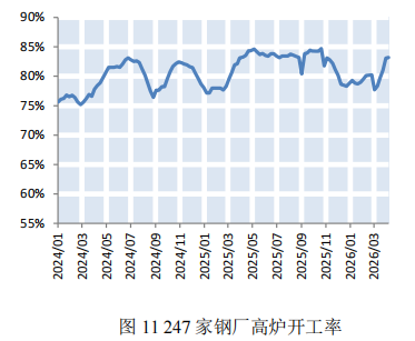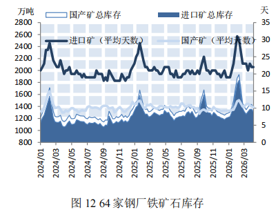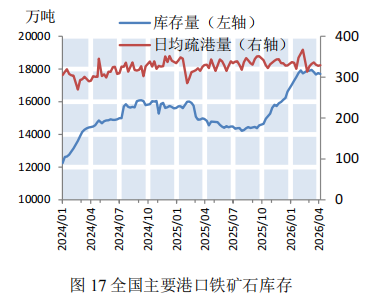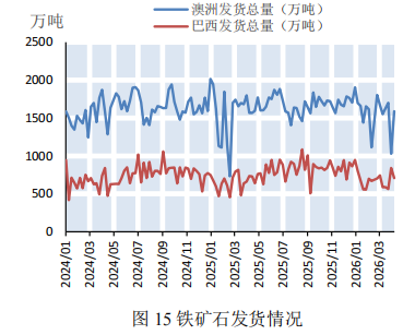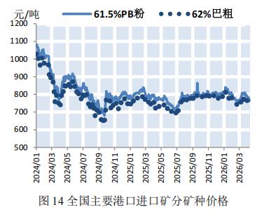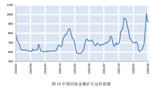 本期,钢材价格微幅下降。截至4月10日,普钢综合指数(绝对价格指数)报收于3439.01点,较上期微幅下降0.34%(如图9)。钢厂盈利率报收于48.05%,较上期小幅上涨4.76%(如图10)。数据来源:Mysteel,上海国际航运研究中心整理本期,钢厂高炉开工率小幅上涨。截至4月10日,全国调研的247家钢厂高炉开工率为83.2%,较上期小幅上涨2.17%(如图11)。本期,全国64家钢厂进口矿库存和国产矿库存均呈上涨态势。截至2026年4月10日,全国调研的64家钢厂进口矿库存1309.21万吨,进口矿平均可用天数22天,较上期减少1天;国产矿库存79.62万吨,国产矿平均可用天数10.26天,较上期减少0.57天(如图12)。数据来源:Mysteel,上海国际航运研究中心整理国产矿方面,本期国产矿价格小幅下降。截至4月10日,霍邱地区65%造球精粉价格指数报收于981点,较上期下跌15点(如图13);进口矿方面,本期进口矿价格小幅下降。截至4月10日,61.5%PB粉报收于766元/吨,较上期下降29元/吨;62%巴粗报收于738元/吨,较上期下降31.5元/吨(如图14)。截至4月10日,澳洲发货总量1588.2万吨,环比下降113万吨;巴西发货总量708.2万吨,环比上涨144.4万吨(如图15)。截至4月10日,全国186矿山样本产能利用率为61.13%,较上期小幅上涨2.09个百分点(如图16)。数据来源:Mysteel,上海国际航运研究中心整理本期,全国主要港口铁矿石库存微幅上涨,日均疏港量微幅下降。截至4月10日,全国主要港口铁矿石库存17693.48万吨,较上期上涨26.65万吨,日均疏港量329.23万吨,较上期微幅下降0.33%(如图17)。按品种分类,粗粉库存13631.57吨,较上期上涨4.68万吨;球团库存397.81万吨,较上期上涨5.15万吨;块矿库存1950.09万吨,较上期减少20.31万吨;铁精粉库存1714.01万吨,较上期上涨37.13万吨(如图18)。数据来源:Mysteel,上海国际航运研究中心整理数据说明:主要港口指包括青岛港、日照港等在内的全国30个主要铁矿石港口预测:铁矿石运价小幅下降,预计下期运价稳中偏弱运行
