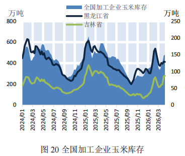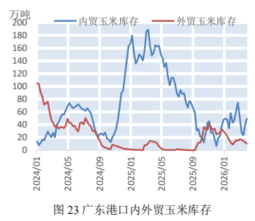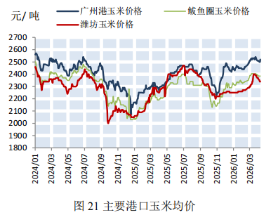 本期,加工企业库存大幅上升。截至4月10日,全国加工企业玉米库存480.4万吨,较上期大幅增长74.1万吨(如图20)。本期北方玉米市场价格涨跌各现。截至4月10日,广州港玉米价格为2520元/吨,较上期(3月27日)持平,鲅鱼圈玉米价格为2385元/吨,较上期下降15元/吨,潍坊玉米价格为2340元/吨,较上期下降40元/吨(如图21)。港口:北方港口下海量大幅下跌,南方港口内贸库存大幅上涨