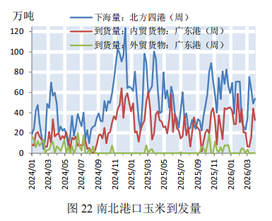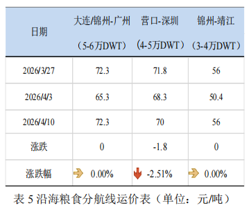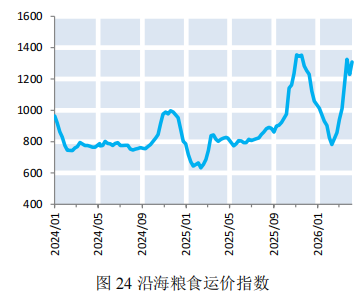 本期,北方港口下海量大幅下跌,南方港口内贸库存大幅上涨。本期(2026年3月28日—2026年4月10日)北方四港玉米下海量共计102.8万吨,较上期(2026年3月14日—2026年3月27日)减少35.9万吨;广东港口内贸玉米到货量为76.8万吨,较上期上涨55.1万吨;外贸玉米到货量为0万吨,较上期持平(如图22)。截至4月10日,广东港口内贸玉米库存49.4万吨,较上期上涨26万吨;外贸玉米库存10.2万吨,较上期减少4.5万吨(如图23)。本期,粮食深加工企业以刚需为主,贸易商收购积极性不高,北方玉米市场价格以下降态势为主,叠加港口集港量逐步下滑,沿海粮食运价小幅下降。截至4月10日,上海航交所发布的沿海粮食运价指数报收于1309.03点,较上期小幅下降1.24%(如图24)。各航线运价涨跌各异,其中营口-深圳(4-5万DWT)运价下降2.51%至70元/吨(如表5)。数据来源:上海航运交易所,上海国际航运研究中心整理下期,市场粮源整体充足,沿海粮食货盘释放缩减,粮食市场交投趋于清淡,预计下期沿海粮食运价震荡偏弱运行。