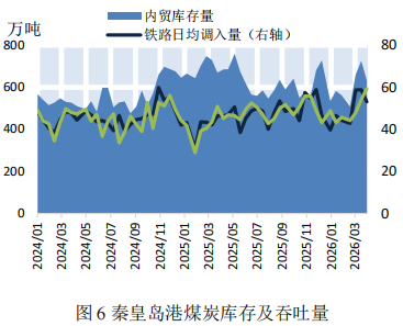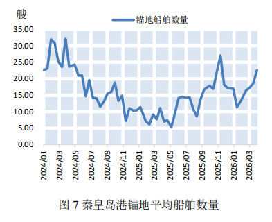 国内煤炭方面,煤价微幅上涨。截至4月10日,秦皇岛港Q5500动力煤现货价格报收于769元/吨,较上期微幅上涨0.13%(如图4)。进口煤价方面,煤价小幅上涨。截至4月10日,印尼Q3800动力煤FOB价报收于60.5美元/吨,较上期微幅上涨0.83%,印尼Q3800动力煤FOB价报收于78.5美元/吨,较上期小幅上涨1.95%(如图5)。数据来源:Mysteel,上海国际航运研究中心整理本期,北方港口库存大幅下降,铁路调入量小幅下降,水路调出量小幅上涨,总体上调入低于调出。本期(2026年3月28日-2026年4月10日)秦皇岛港口煤炭日均铁路调入量为53.06万吨,较上期(2026年3月14日-2026年3月27日)小幅下降9.73%;日均水路调出量59.34万吨,较上期小幅上涨9.62%;秦皇岛港内贸煤炭库存为633万吨,较上期大幅下降12.69%(如图6)。本期秦皇岛港锚地平均船舶数量23艘,较上期增加4艘(如图7)。数据来源:Mysteel,上海国际航运研究中心整理预测:各航线运价呈下降态势,预计下期运价将承压下行