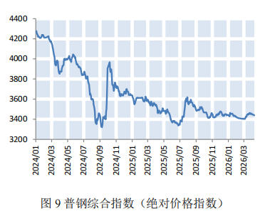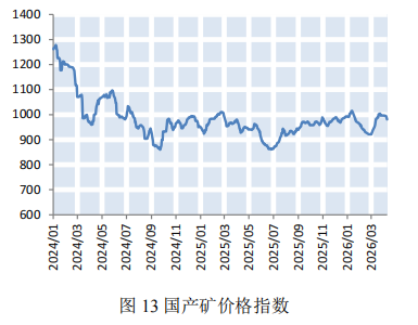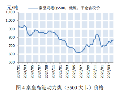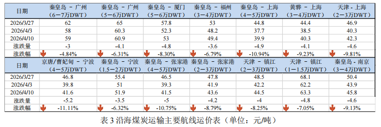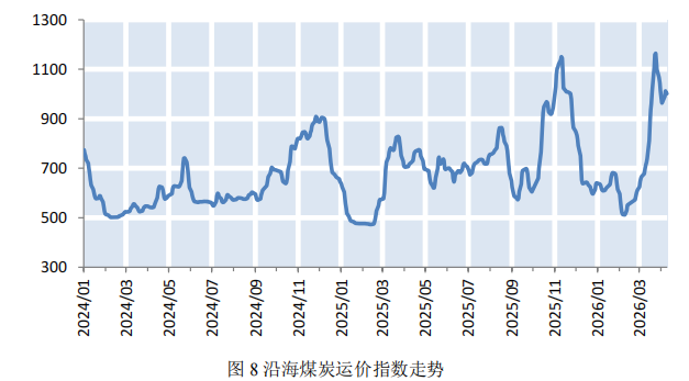 本期全国多数地区气温持续回升,煤炭需求进入季节性淡季,叠加部分电厂陆续开展检修,日均耗煤量显著回落。同时,大秦铁路启动集中维修养护,煤炭集港效率有所下滑,沿海煤炭运价小幅下降。截至4月10日,上海航运交易所发布的沿海煤炭运价指数报收于1001.44点,较上期小幅下降8.81%(如图8)。下期,电厂以消耗库存为主,维持长协刚需采购,煤炭需求释放有限,预计下期沿海煤炭运价将承压下行。