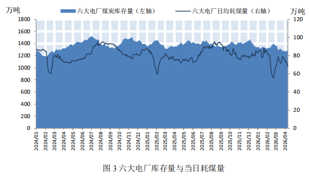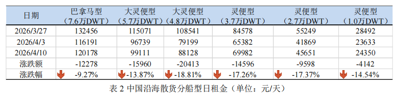 上海航运交易所2026年4月10日发布的中国沿海干散货运价指数报收于1169.43点,较3月27日下降5.37%(如图1)。三大货种方面均小幅下降,其中煤炭运价降幅最大(如表1)。数据来源:上海航运交易所,上海国际航运研究中心整理上海航运交易所2026年4月10日发布的中国沿海散货船日租金指数(CDI)报收于2923.79点,较3月27日大幅下降13.88%(如图2)。各船型租金均呈下降态势,其中大灵便型(4.8万DWT)大幅下降18.81%至88128元/天(如表2)。数据来源:上海航运交易所,上海国际航运研究中心整理截至4月10日,沿海六大电厂的存煤量为1278.2万吨,较上期末微幅下降0.17%;日均耗煤量为68.26万吨,较上期末大幅下降13.17%;可用天数维持在18.7天左右,较上期增加2.5天(如图3)。数据来源:中国煤炭资源网,上海国际航运研究中心整理