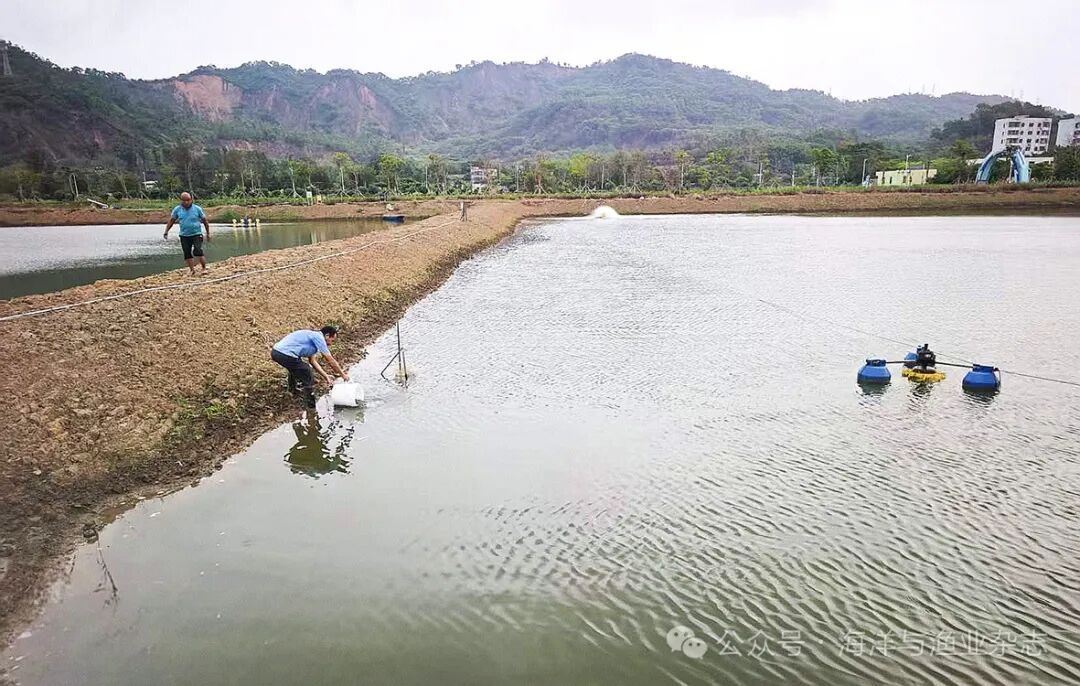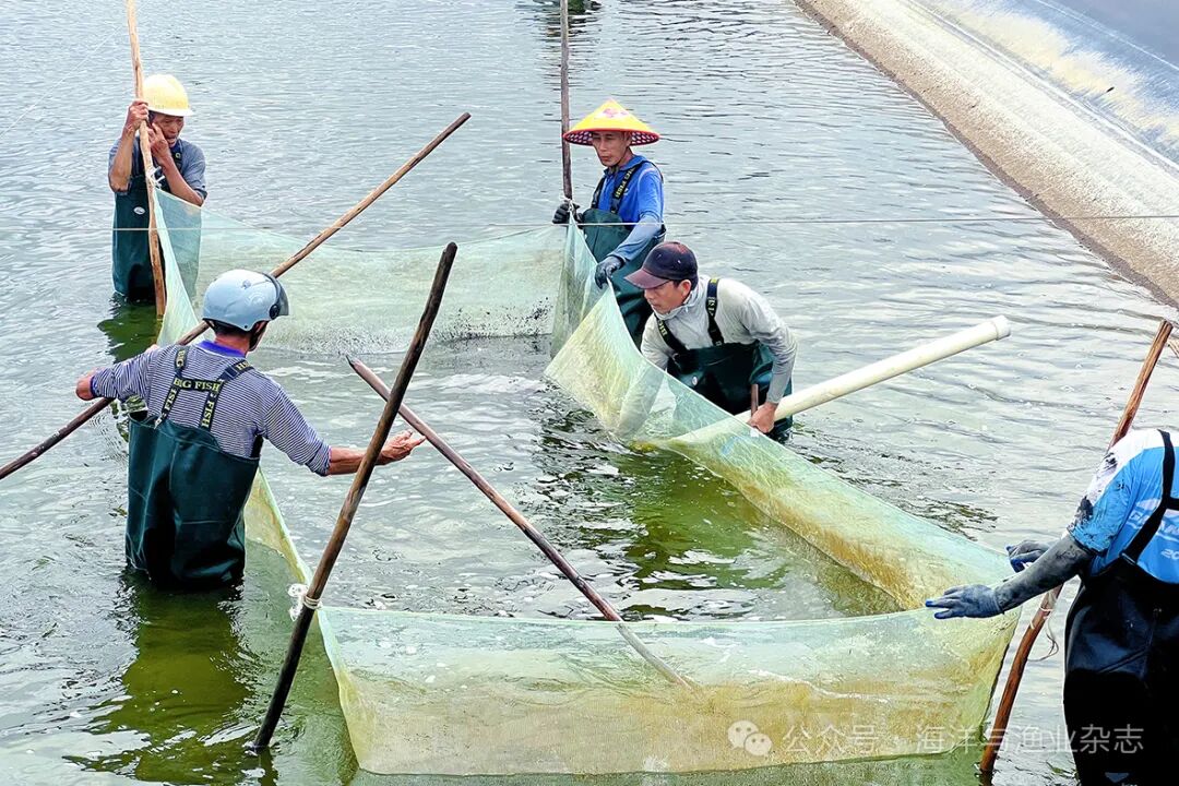 ▲ 企业将黄鳍棘鲷种苗投入池塘开展试养