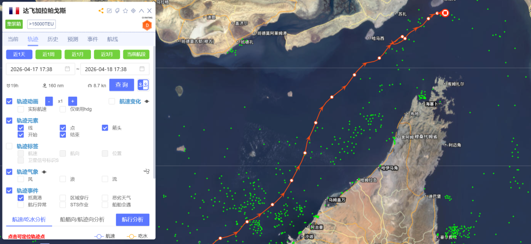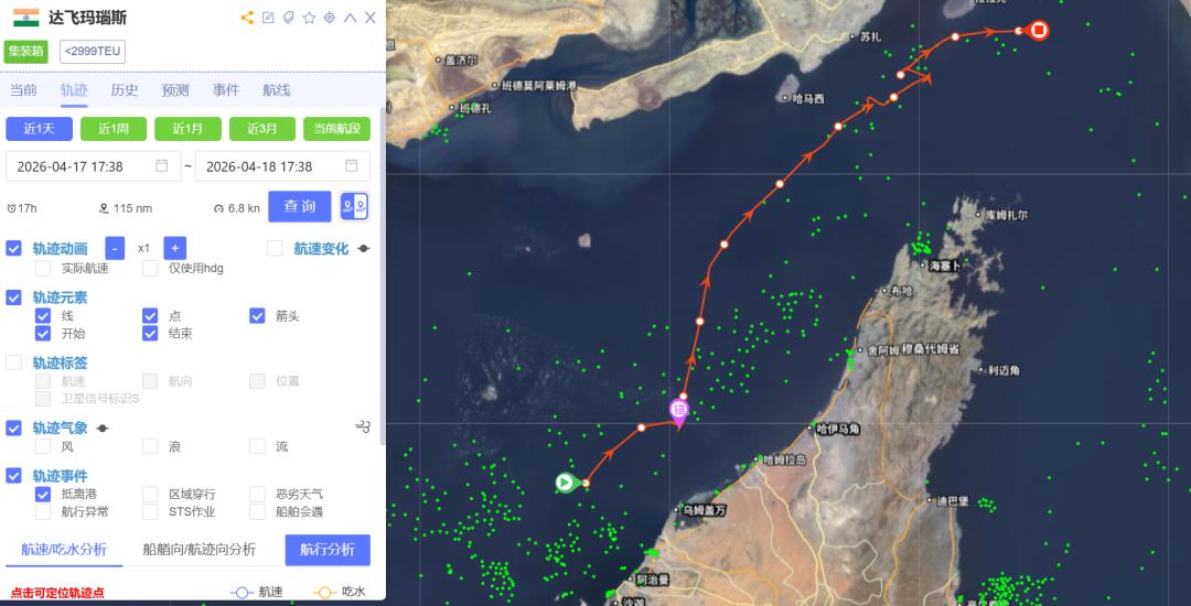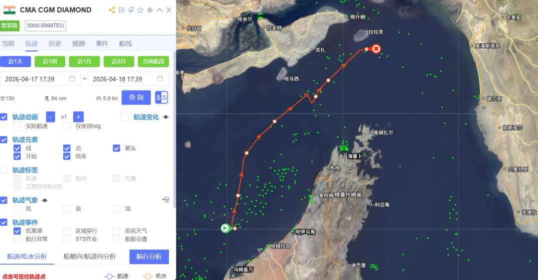 此外,达飞集团旗下多艘集装箱船也在行动中,其中“CMA CGM EVERGLADE”轮(载箱量15254TEU)、“CMA CGM MANAUS”轮(载箱量2556TEU)正处于海峡通行过程中,“CMA CGM GALAPAGOS”轮(载箱量15254TEU)、“CMA CGM DIAMOND”轮(载箱量3534TEU)则正朝海峡方向航行,准备驶离海湾。