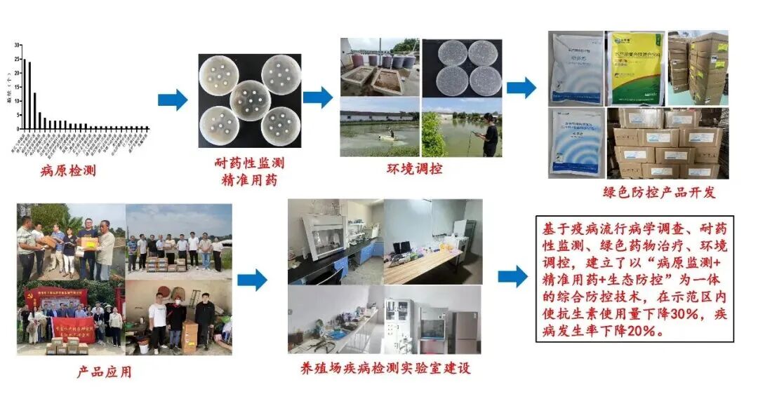 该团队基于前期研究,构建了覆盖全养殖周期的“监测预警—精准用药—生态调控”三位一体综合防控技术体系。通过建立企业级病原检测与药敏平台,推动病害防治从“经验用药”转向“精准用药”;集成应用噬菌体、益生菌及中草药,实现防控模式从被动治疗、依赖化学药物向主动管理、绿色综合调控的重要转变。应用该体系使病害发生率下降20%,抗生素用量减少30%。相关成果“中华鳖种苗繁养主要疾病绿色生态防控技术集成与示范应用”已在湖北省科学技术厅完成登记。