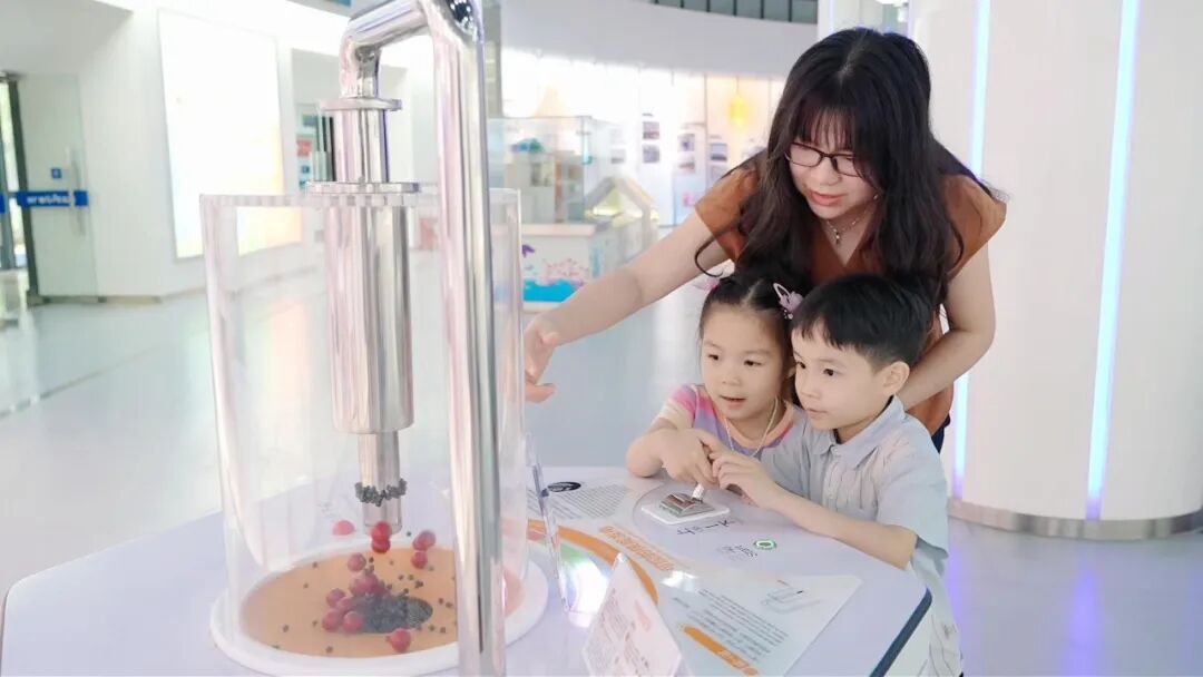 这份新工作,也为林意君的家庭带来了新的互动。每次讲解前,两个孩子就是她的“专属陪练”。耳濡目染之下,两个小家伙也成了“核电小专家”。她在家练习讲解时,孩子们总会抢着补充:“白海豚刚出生时是灰色的,长大才会变白!”这天在科普展厅,他们更是全程黏在妈妈身边,一会儿指着模型问个不停,一会儿又学着讲解的样子有模有样地复述。林意君看着他们专注的侧脸,笑意从眼底漾开——原来那一颗颗被她亲手播下的科普种子,早已在孩子的世界里,悄悄发了芽。