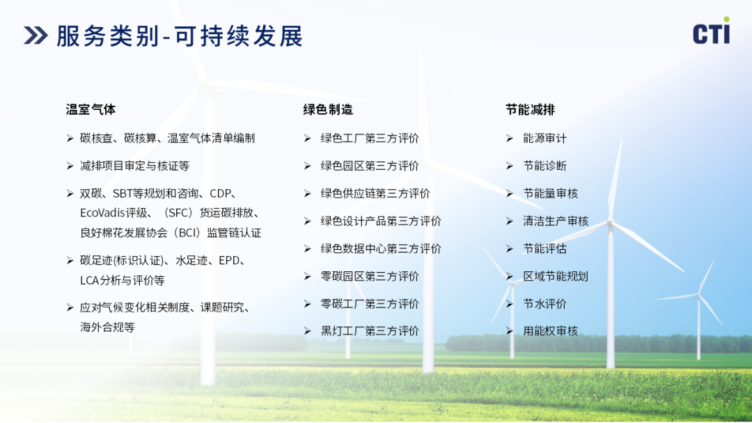 CTI 华测认证始终以 “创建低碳健康美好未来” 为使命,依托全链条双碳服务能力(碳核算、碳核查、碳足迹核查、碳中和核查、ESG 咨询、CBAM 合规等),为建材、工业、建筑等行业提供从标准解读、数据核算到权威认证的一站式解决方案。