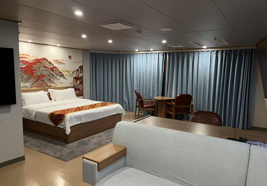 烟连航线船舶一等及以上舱位均已实现全方位服务升级,房间标配免费零食及清凉饮品,床品柔软舒适、洗漱用品精致齐全,配置对标四星级酒店标准,让您在海上也能享受温馨、静谧的休憩空间。为携带宠物的旅客提供寄存服务,让爱宠同行更安心,真正实现“人宠无忧、畅行渤海”。