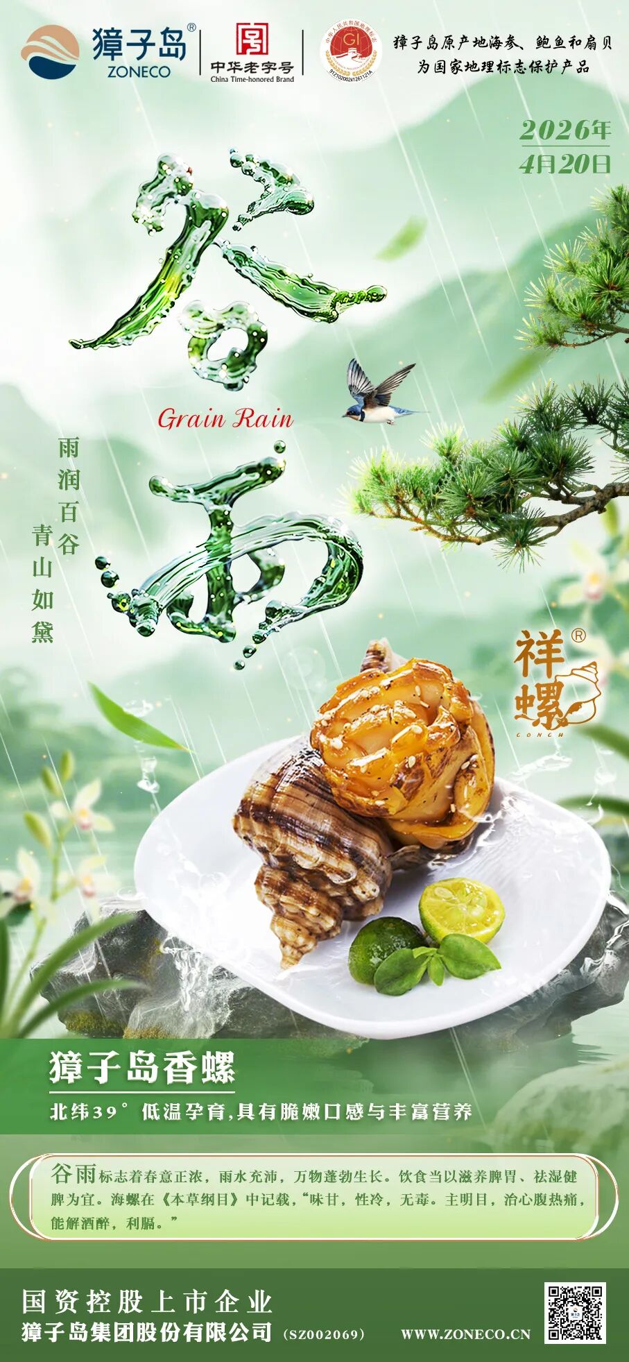 谷雨至,百谷生。此时,春风和煦,细雨绵绵,万物焕发出勃勃生机,正是调养脾胃、寻鲜食补的最佳时机。正所谓“春日时令,贝肥螺美”,此时的海螺吸足了深海的精华,肉质最为饱满丰腴。海螺在李时珍所著《本草纲目》中记载有“味甘,性冷,无毒。主明目,治心腹热痛,能解酒醉,利膈”。獐子岛香螺,源自北纬39°冷水海域,肉质鲜嫩清甜,每一口都是海洋的馈赠,既可尝鲜味,又能为健康添活力。