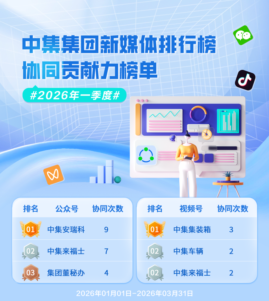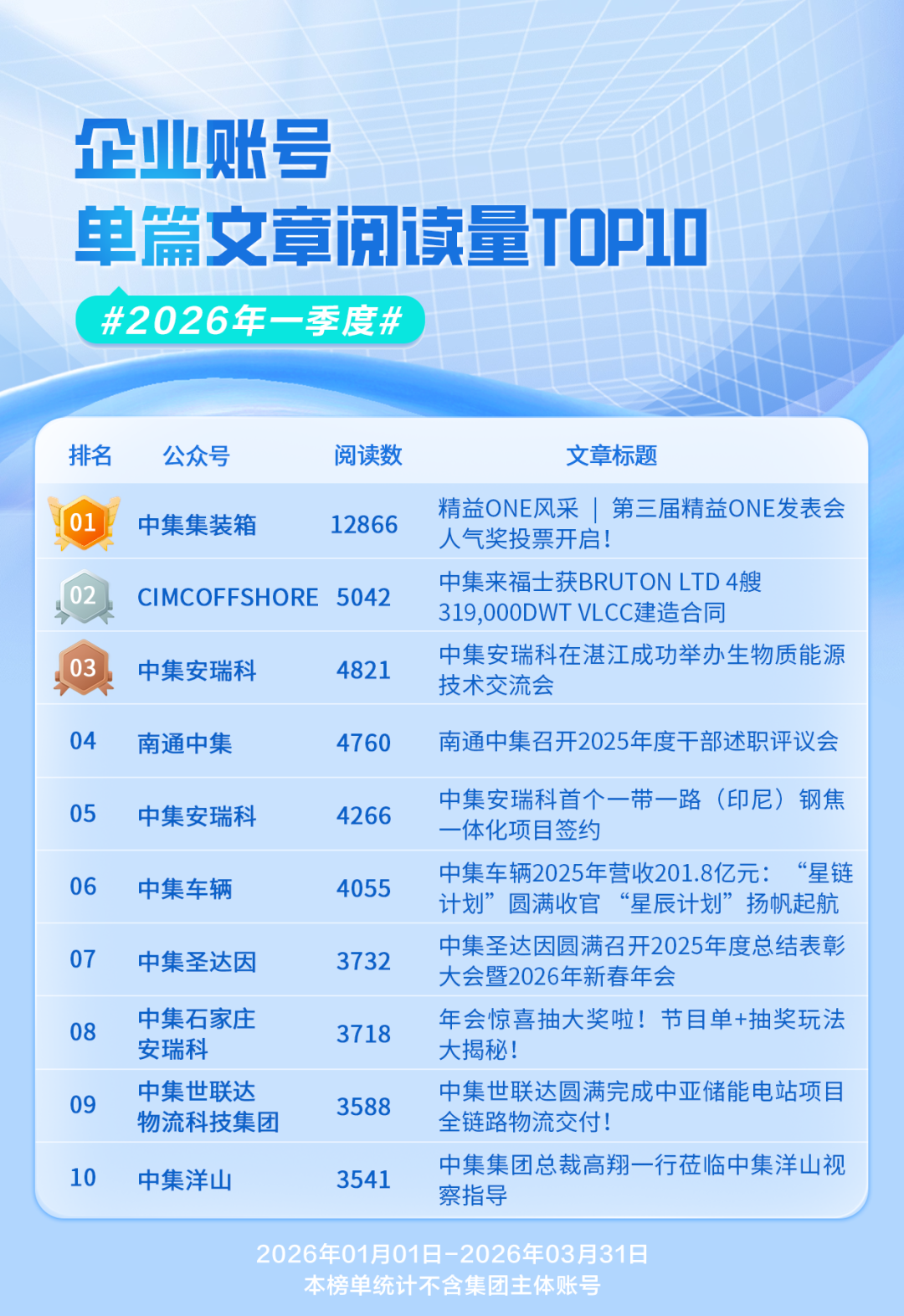 一季度,中集集团公众号以651.7的微信指数位列第一,阅读总量突破16.7万。内容聚焦企业核心业绩与关键事件,联动各业务板块及所属企业推进协同共创,持续传递中集重要动态与积极进展。