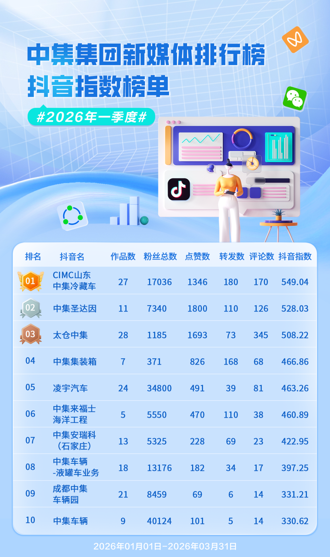 2026年一季度微信指数前十名的账号依次是:中集集团、中集集装箱、中集安瑞科、中集海工人、新会中集、中集车辆、中集洋山、中集宏图、中集太平洋海工、中集石家庄安瑞科。