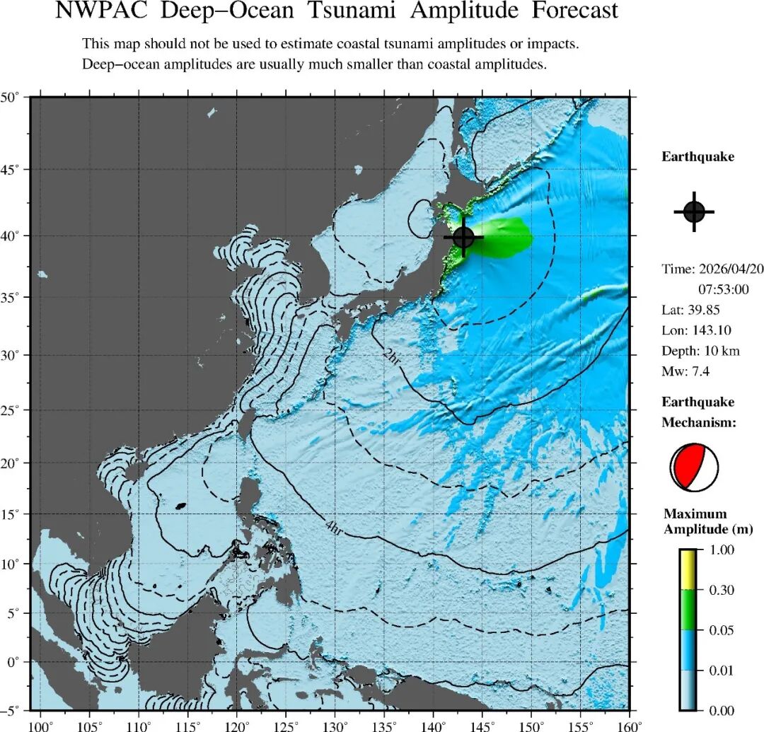 据中国地震台网正式测定,2026年04月20日15时53分(北京时间),日本本州东岸远海海域(39.85°N,143.10°E)发生7.4级地震,震源深度为10千米。
