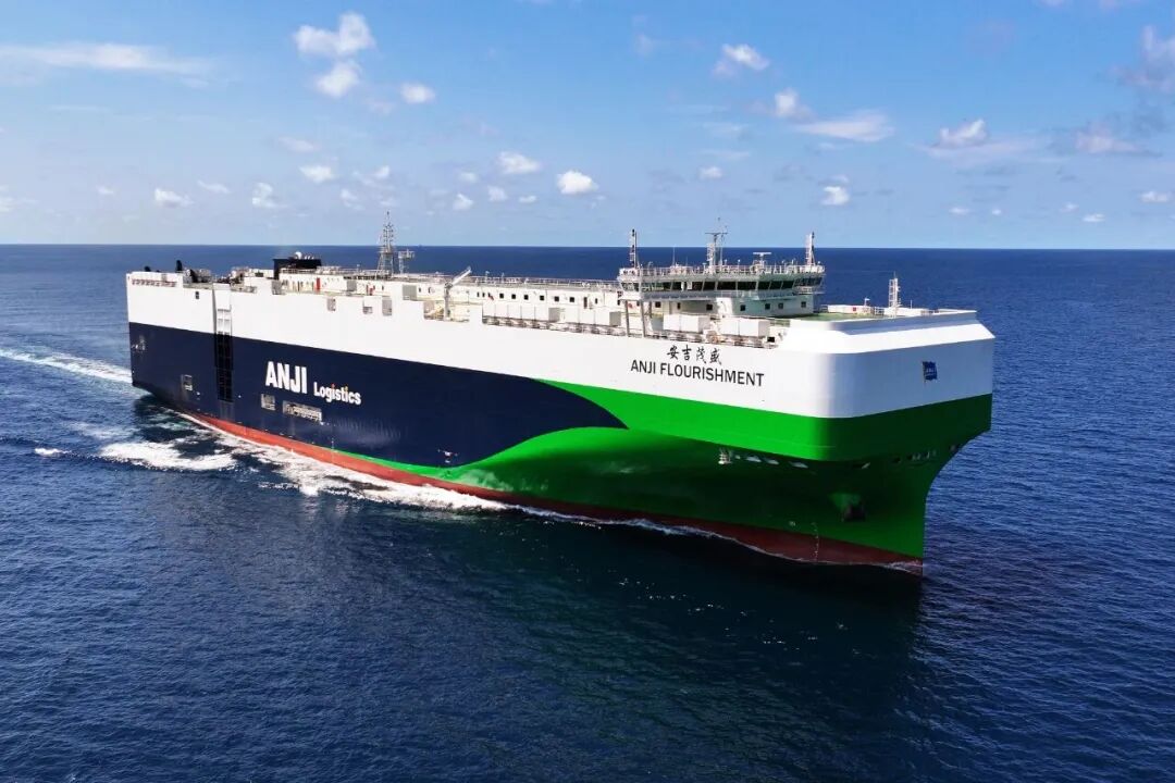 “安吉吉盛”号设计总长228米,服务航速18.54节,入级中国船级社(CCS)。该系列船由中船集团旗下上海船舶研究设计院设计,江南造船建造,拥有完全自主知识产权。该型船核心设备均实现国产化,其配备的MAN B&W 7S60ME-C10.5-HPSCR主机以及SCRUBBER系统、滚装设备系统等核心关键设备均由中船集团旗下公司生产。