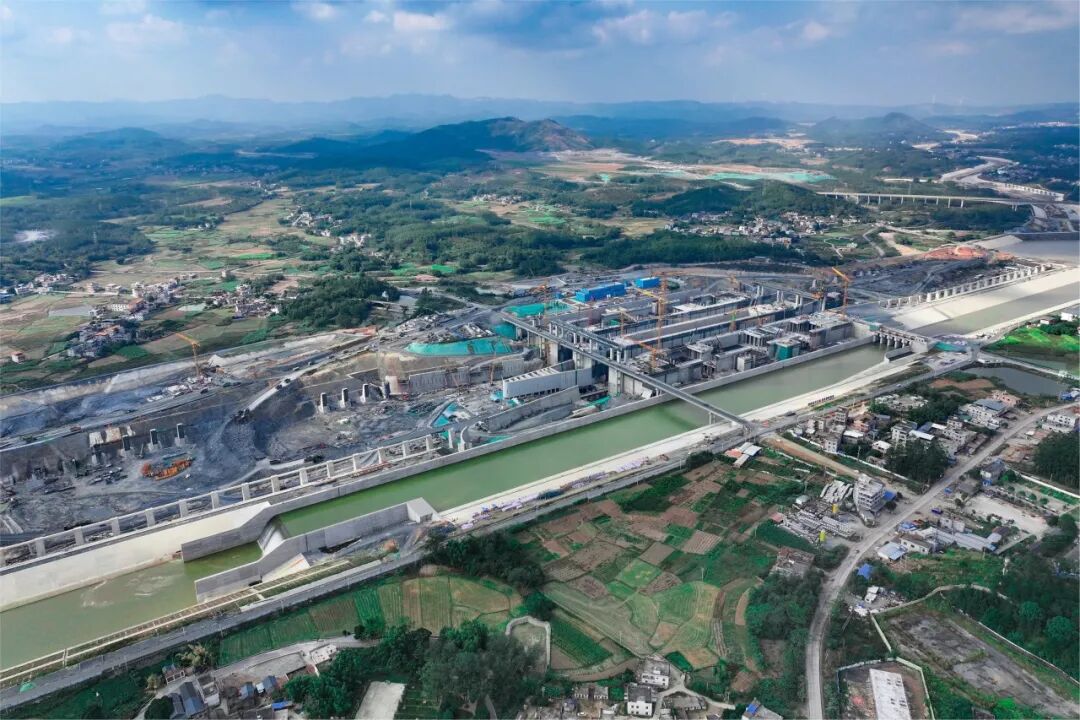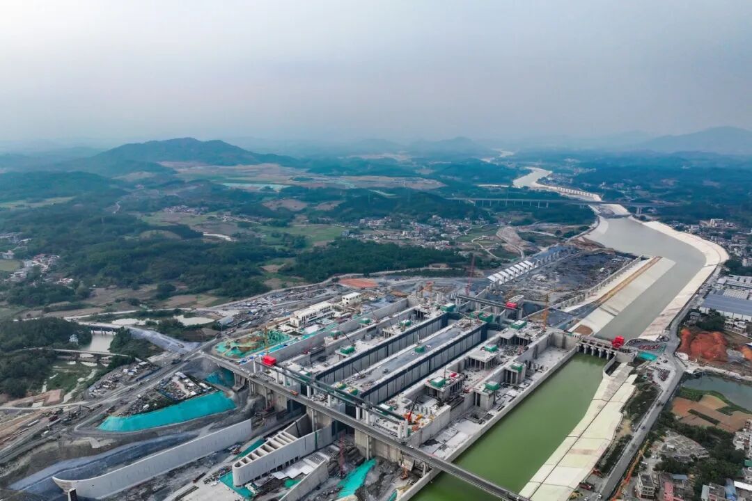 繁忙的工作场景同样在企石枢纽的吊装现场上演。企石枢纽共需安装8扇人字门,其中上闸首4扇,单扇重约296吨、高11.6米;下闸首4扇,单扇重达978吨、高36.4米。人字门采用分节制造工艺,每节重约100吨,吊装作业由500吨和350吨履带式起重机配合完成,实现高精度定位。当500吨与350吨履带起重机协同作业,将重达978吨的人字门缓缓吊起,每节门叶对接误差严格控制在毫米级。面对27.5米的高差和55度的堰面坡度,建设者们用325万立方米土石方开挖、18.8万立方米混凝土浇筑,把不可能变成了可能。2025年3月下旬,企石枢纽首期送电成功,三大枢纽全部“通电就位”,设备联调联试全面展开。