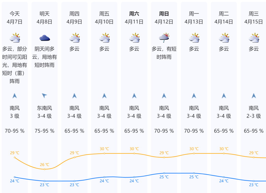深圳今日多云,局地偶有短时雷阵雨;气温24-29℃。