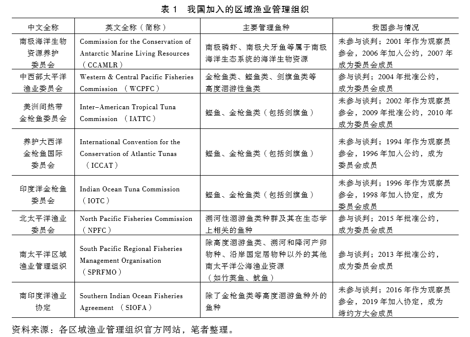 我国已加入覆盖全球主要远洋渔业作业区域的各大区域性渔业管理组织(表1),其参与范围不仅涵盖传统的作业海域,也展现出前瞻性的全球治理布局。在参与路径上,经历了从“旁观者”到“谈判方”,再到“深度参与国”的转变过程,在多个组织中均实现了从观察员向正式缔约方的制度跃升。作为多个RFMOs的重要成员,我国在国际渔业事务中逐步增强了话语权,不仅在国际捕捞配额谈判、资源评估及执法合作中扮演了重要角色,也通过科学研究、联合监测等方式提升了在全球渔业治理体系中的参与度。