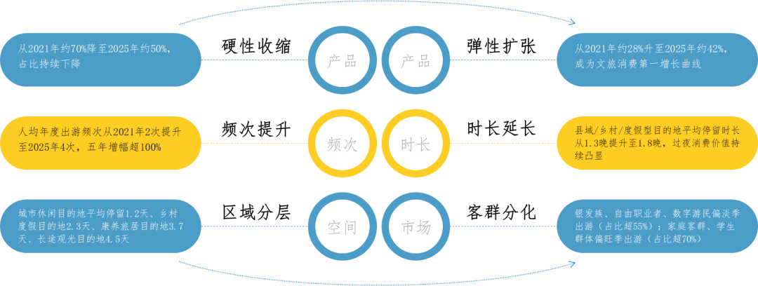 (2)五年占比变化:从2021年约28%升至2025年约42%,成为文旅消费第一增长曲线,增速显著高于硬性消费。