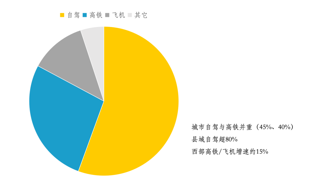 (1)各交通方式占比:自驾52%-58%、高铁约27%、飞机约12%、其他约3%-9%,自驾为短途主力。