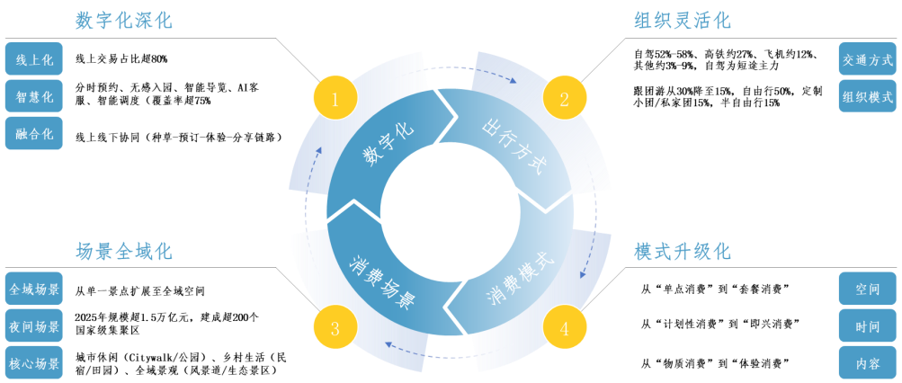 第四,消费行为全面数字化即时化,决策、预订、体验、分享全链路重构。短视频与社交平台触发超60%的出行决策,即时决策占比超40%,线上交易占比超80%,自由行占比约50%,智慧服务覆盖率提升至75%。消费行为呈现“决策短周期、预订轻量化、行程弹性化、体验即兴化、分享常态化”五大特征,传统跟团游持续萎缩,定制小团、半自由行、自驾出行成为主流,行前-行中-行后全链路闭环形成,数字平台成为文旅消费的核心基础设施。