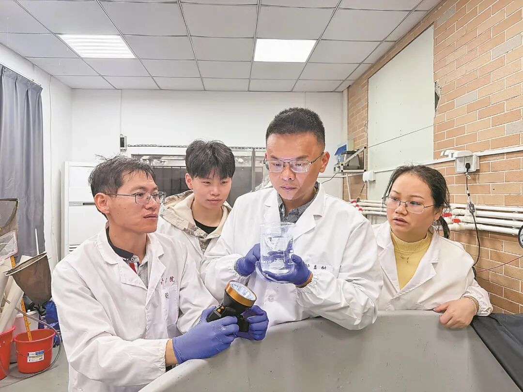 陈仕玺教授(右二)与团队成员正在观察刚出生的仔鱼