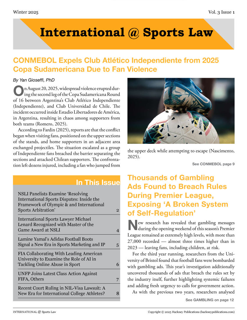 本刊为季刊出版物,追踪全球体育相关诉讼的最新发展动态,以订阅形式向高等教育机构及体育法律学者提供。