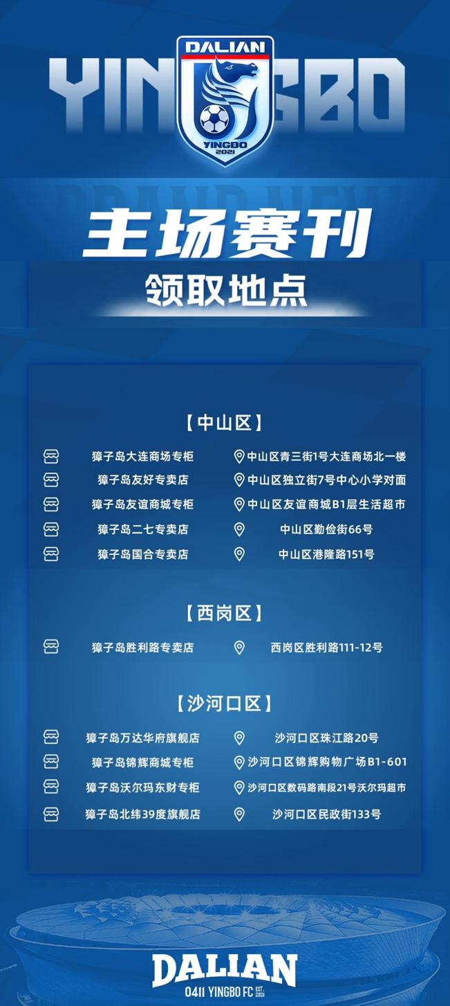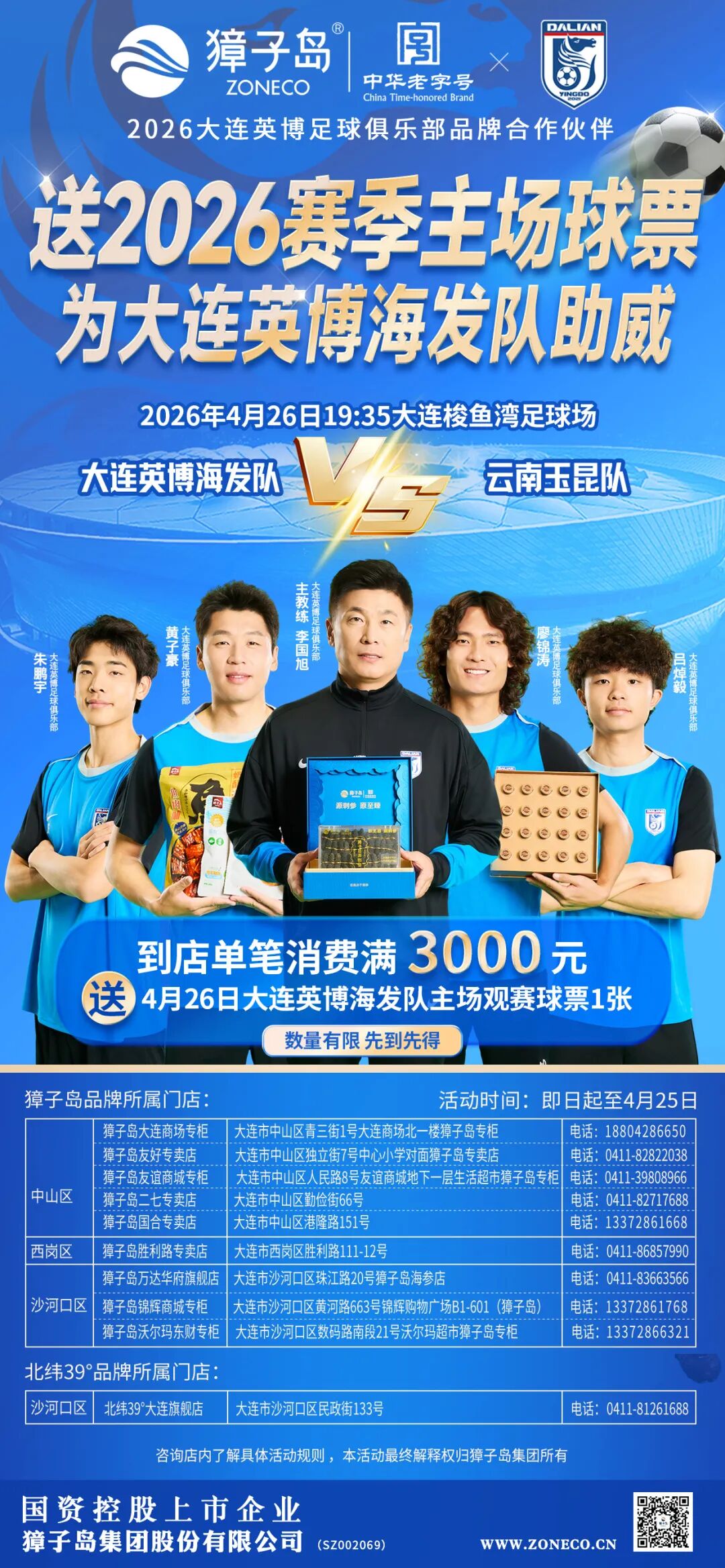 即日起至4月25日,凡在大连地区的獐子岛品牌、北纬39°品牌直营门店以及抖音平台“獐子岛官方旗舰店”单笔消费满3000元,即可获赠4月26日英博海发队主场球票一张!数量有限,先到先得,赠完即止。