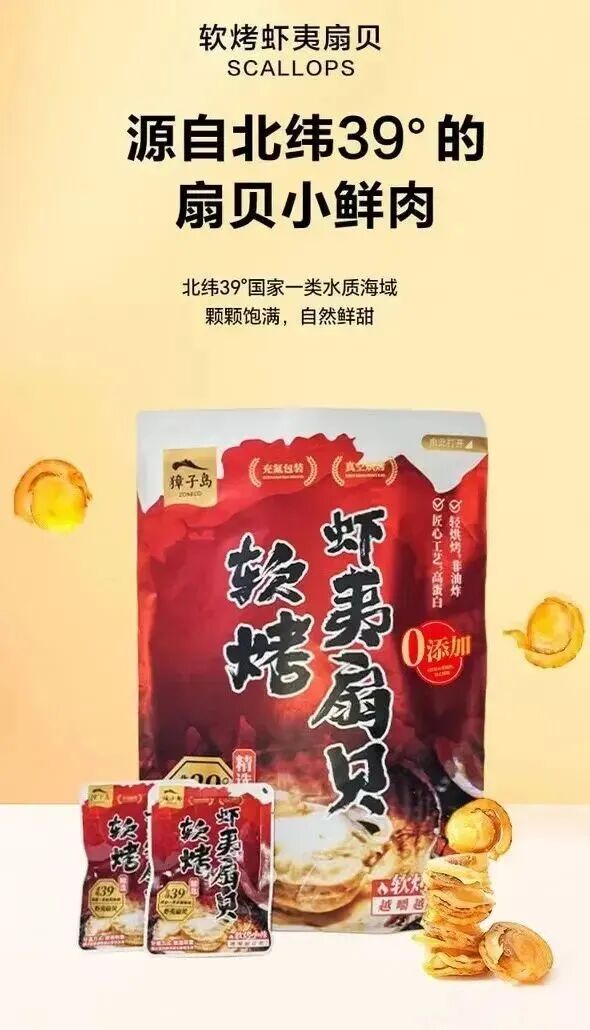 软烤虾夷扇贝的原料来自于北纬39°獐子岛国家级海洋牧场示范区,独特地理区位与优良水质,孕育出肉质鲜嫩、口感肥美的虾夷扇贝。獐子岛扇贝获国家地理标志保护产品、有机产品认证,并入选全国名特优新农产品名录,品质上乘,值得信赖。