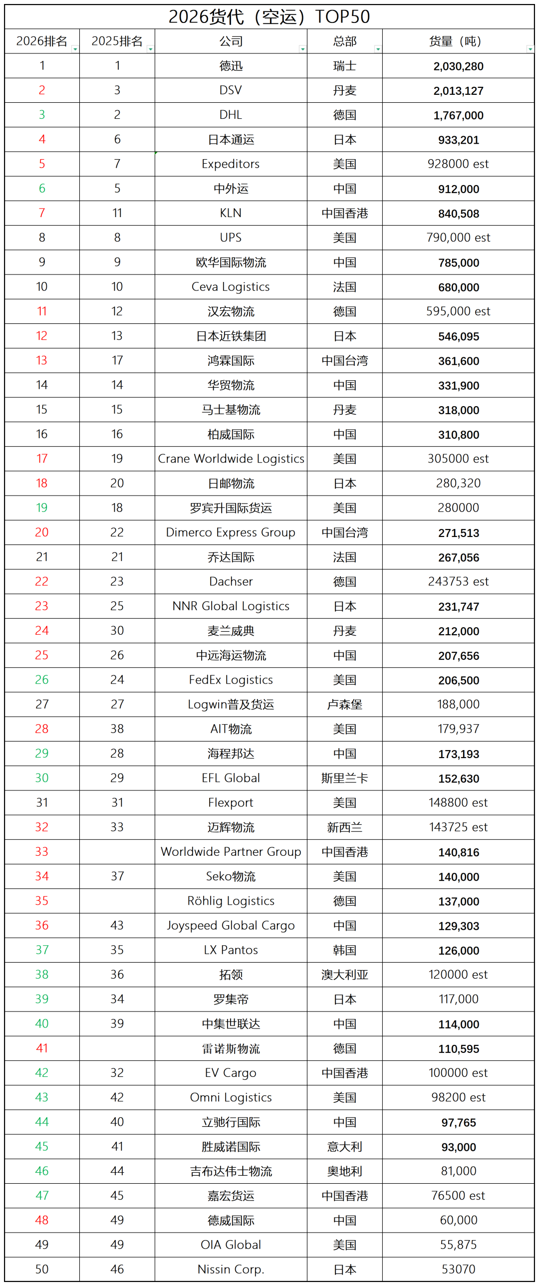 具体而言,根据《Transport Topics》数据,在全球货代(海运)TOP50中,中外运以492万TEU的箱量蝉联榜首,德迅集团以432万TEU的箱量位列第2,DSV则以370万TEU的箱量排名首次上升至全球第3。与2025排名相比,入围全球货代(海运)TOP50榜单的箱量接近30万TEU。特别值得一提的是,在全球货代(海运)TOP50中,排名前11的公司海运箱量均突破110万TEU。其中DHL排名降至第4;中远海运物流排名跃升至第5;宁波港东南物流集团排名第6;日本通运凭借181万TEU排名第7;达飞集团旗下Ceva Logistics则凭借173万TEU箱量排名第8;韩国LX Pantos位列第9;罗宾升国际货运排名第10位;KLN排名第11,箱量约为115万TEU。在2026全球货代(海运)TOP50中,共有16家中国企业上榜。特别值得一提的是,中集世联达凭借96万TEU的箱量排名升至第13。环世物流排名第15、华贸物流排名第18、东方海外物流排名第19、海程邦达排名第28、长帆国际物流排名第29、沛华集团排名第31、嘉宏货运排名第32、汇利达国际货运代理排名第36、Honour Lane Shipping排名第43、欧华国际排名第454、EV Cargo排名第47。在《Transport Topics》全球货代(空运)TOP50中,共有16家中国企业上榜。具体而言,中外运排名第6、KLN排名第7、欧华国际排名第9、鸿霖国际货运排名第13、华贸物流排名第14、柏威国际排名第16、Dimerco Express Group排名第20、中远海运物流排名第25、海程邦达排名第29、Worldwide Partner Group排名第33、Joyspeed排名第36、中集世联达排名第40、EV Cargo排名第42、立驰行国际排名44、嘉宏货运排名第47、德威国际排名第48。2025全球货代(海运)TOP50榜单 中外运荣登榜首!| 航运界