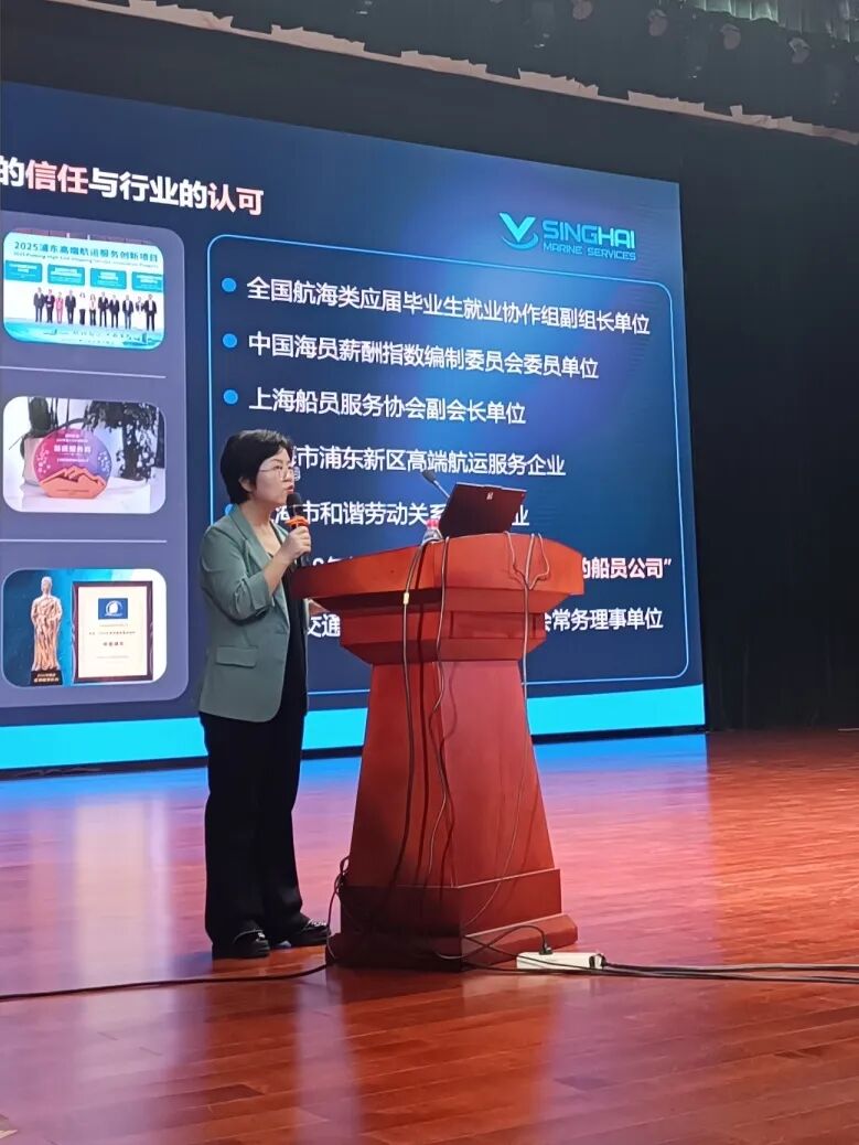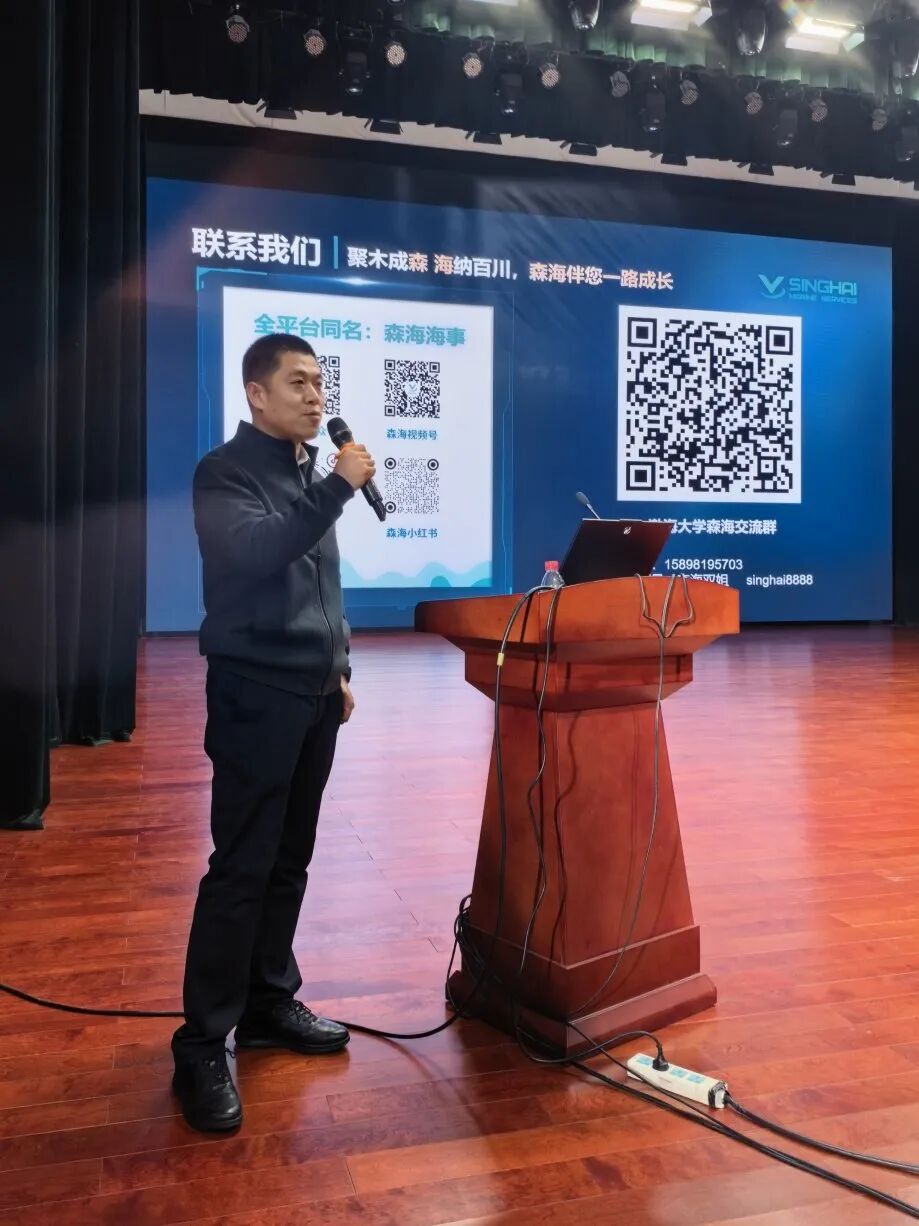 李双经理详解森海合作船东特点、用人标准与发展前景,为新生锚定职业方向,为毕业生厘清求职路径。姚远船长以平实语言讲述海上工作日常,为新生勾勒职业轮廓,为毕业生补上“岗前认知课”。宣讲尾声,李双向2025级新生发出邀请:“森海愿做大家航海路上的同行者,并肩向前。”