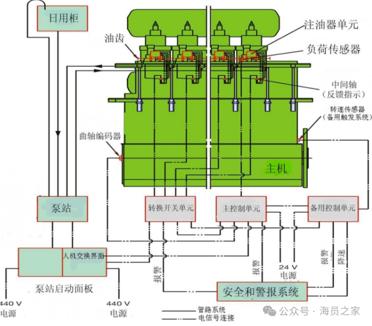 主机型号:6S50MC,全系配置ALPHA 纯电子气缸注油器,无机械备用注油结构,气缸润滑完全依赖电控系统,对传感器、线路、控制单元可靠性要求极高。整套润滑核心组成:泵站 + ALPHA 独立注油单元 + ALCU 注油控制装置 + 负荷变送器 + 主机触发 / 辅触发系统 + 控制面板。