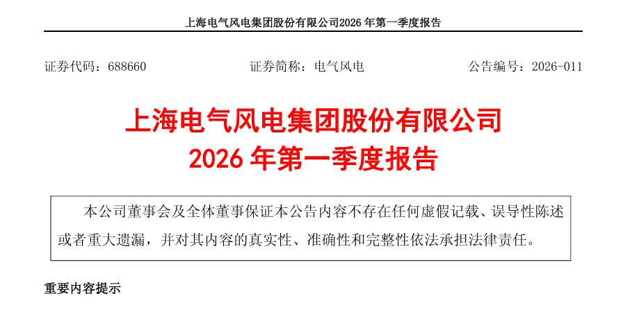 4月21日,上海电气风电集团股份有限公司(以下简称“电气风电”或“公司”)发布《2026年第一季度报告》。