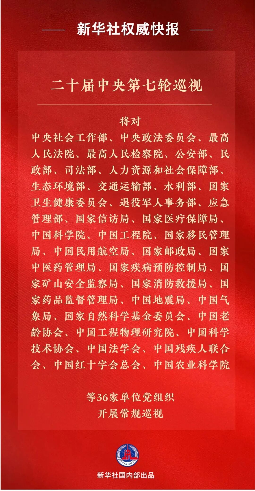 ● 二十届中央第七轮巡视将对中央社会工作部、中央政法委员会、最高人民法院等36家单位党组织开展常规巡视。