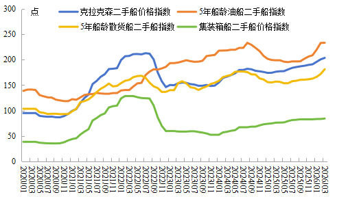 2026年一季度,全球共成交二手船640艘、4967.2万载重吨、191.2亿美元,成交吨位与金额均创下历史单季新高。分船型看,二手油船共成交193艘、3007.8万载重吨、94.9亿美元,创历史新高,按载重吨计占比60.4%;二手散货船共成交220艘、1534.8万载重吨、40.1亿美元,按载重吨计占比30.9%;二手集装箱船共成交60艘、192.3万载重吨、5.0亿美元,按载重吨计占比3.9%。从船价看,3月份,克拉克森二手船价格指数收于213点,同比上涨15%,较年初上涨4%。其中,二手油船、散货船价格指数分别收于234点、181点,创历史新高,二手集装箱船价格指数收于84点,较前期高点仍有较大差距。(撰稿人:杨月斌)