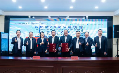4月18日,湖南湘船重工有限公司与麦克斯韦尔船舶管理私人有限公司(Maxwell Ship Management)举行新加坡60米油船项目签约仪式。