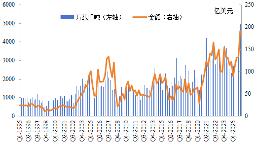 图1. 全球二手船成交量与金额(季度均值)